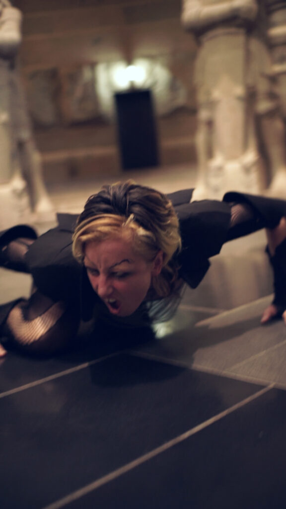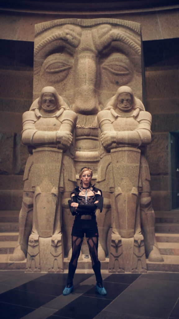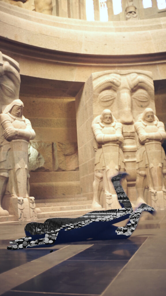 In this production, Clara Winter as Archangel Michael slips into the heart of the monument. There he joins in the lamentations of the soldiers. But this performance of masculine mourning is overlaid with outbursts of blood lust and sexual desire. The themes dealt with include the willingness to submit, which is evoked in the monument as a national virtue, the search for ecstasy, achieved through the thirst for blood in a war, during a rave or through physical devotion. But also tourism and the new cleanliness that sterilise our encounter with this place today.